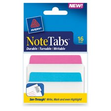 Avery Consumer Products Products - Traditional Tab, 3"x1-1/2", 16/PK, NE/BE/MA, CL - Sold as 1 PK - Note Tabs are a flexible organization tool that combines the best of notes, tabs, and flags in one. Tabs are made of a durable film material with a paper tab overlay. Self-adhesive tabs are transparent and repositionable. Tabs will not lift ink when repositioned. Use them to quickly find pages like a divider for easy reference. Write on both tab and body surfaces.
